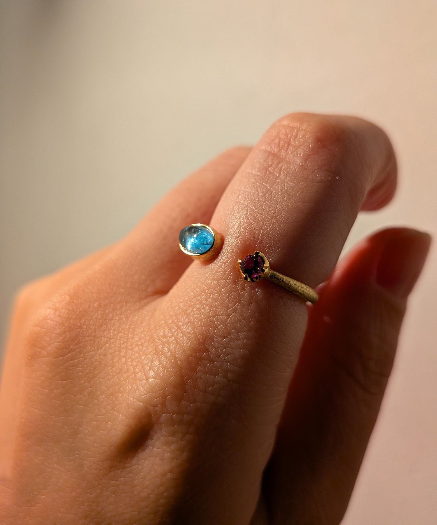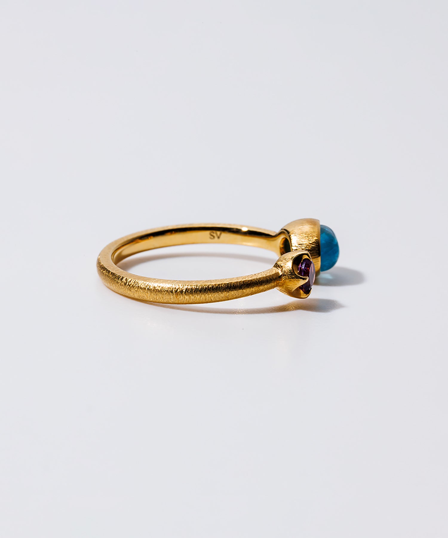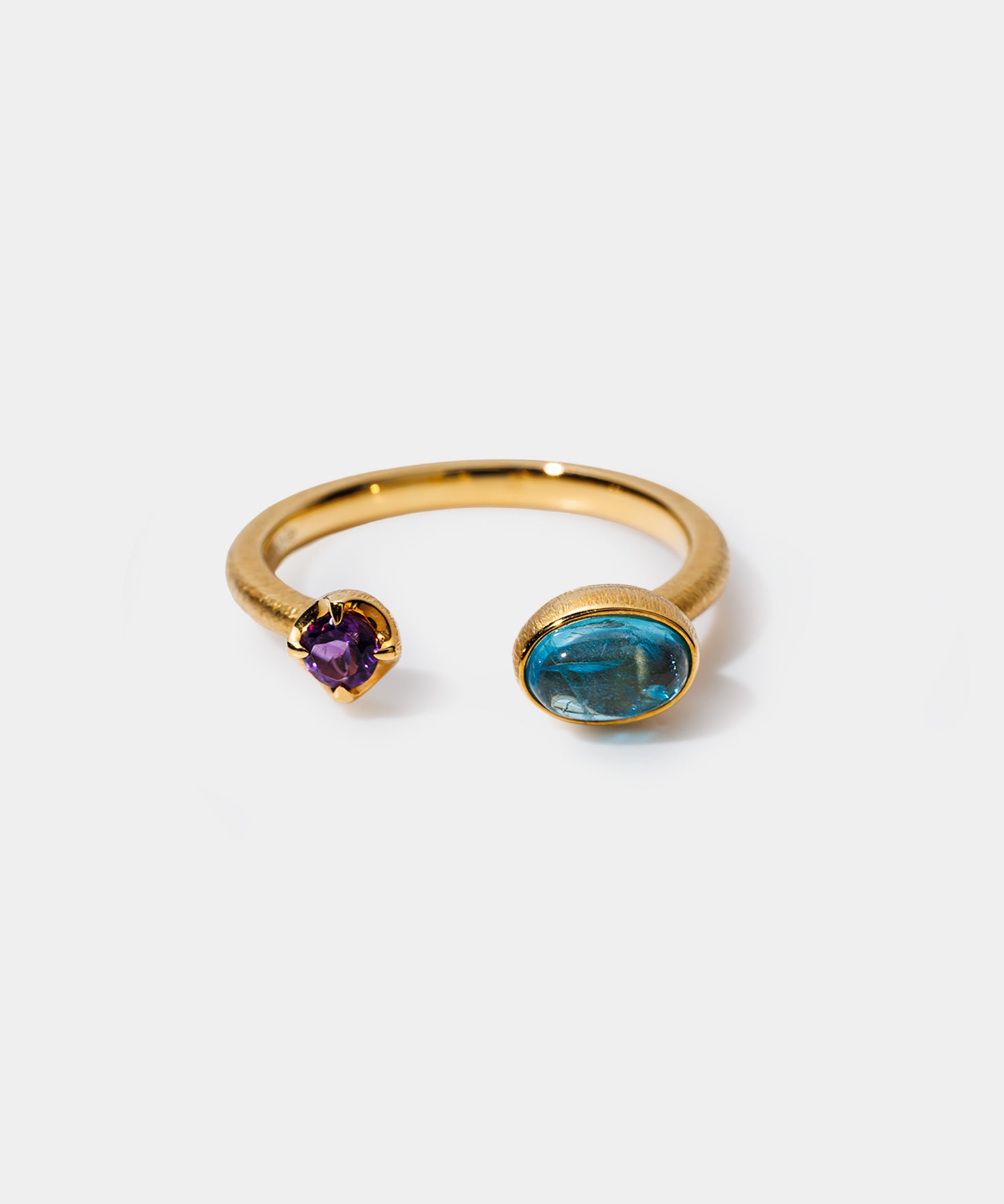 ラテン語の“双子”を語源として名付けられた「Gimmel(ギメル)」シリーズ。Fruitsjolie のギメルは様々な型をご用意しており、お好きなルースを2つ選んでオーダーしていただけます。ルースの配色や形など組み合わせ次第で与える表情も様々で、あなたの個性が溢れます。また、輪っかの一部が切れてアルファベットの“C”のような形になっているため、着け心地が良く、特徴的なフォルムはコーディネートの幅を広げてくれます。
