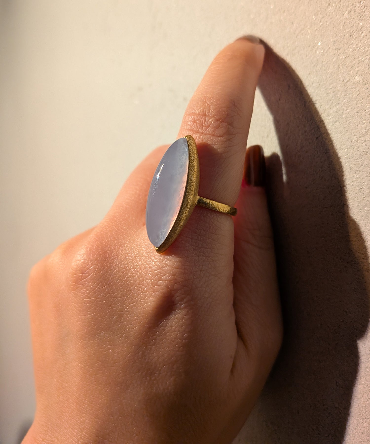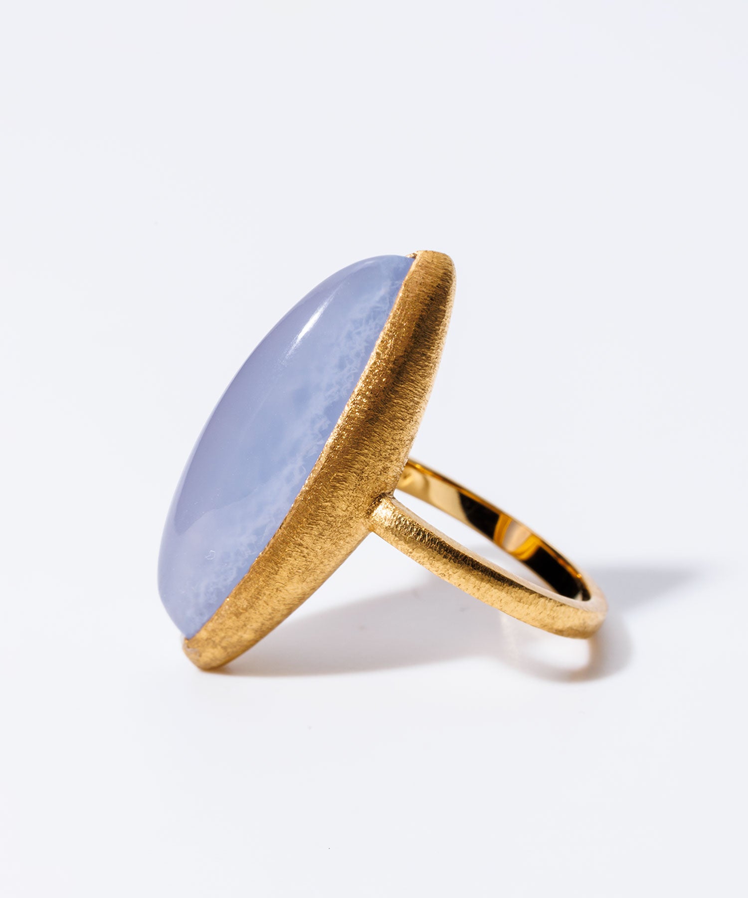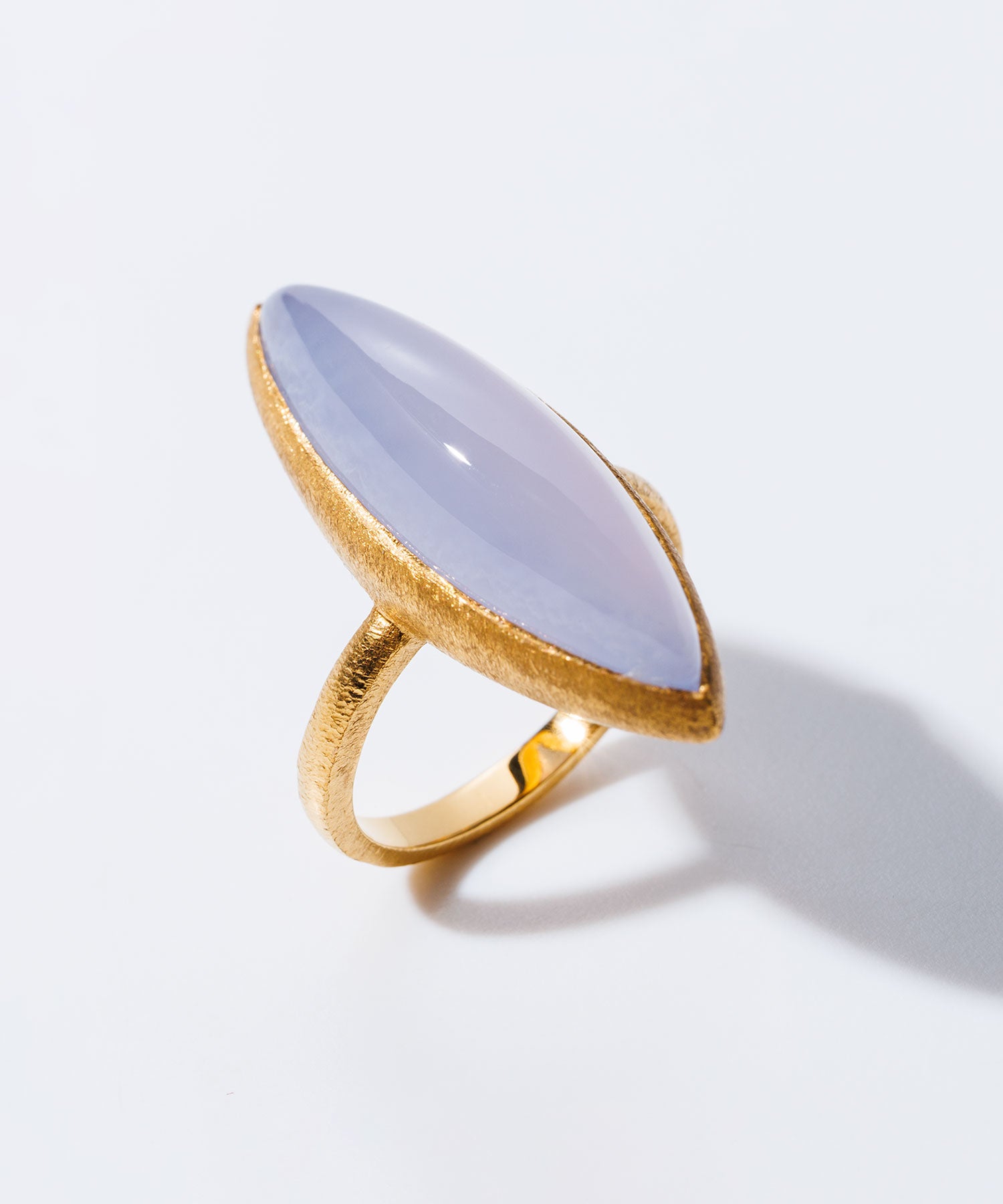 少し青味がかったやわらかな透け感が特徴的な「ブルーカルセドニー」。どのコーディネートにも自然と調和してくれる優れもので、最初に取り入れていただきたいアイテムのひとつ。