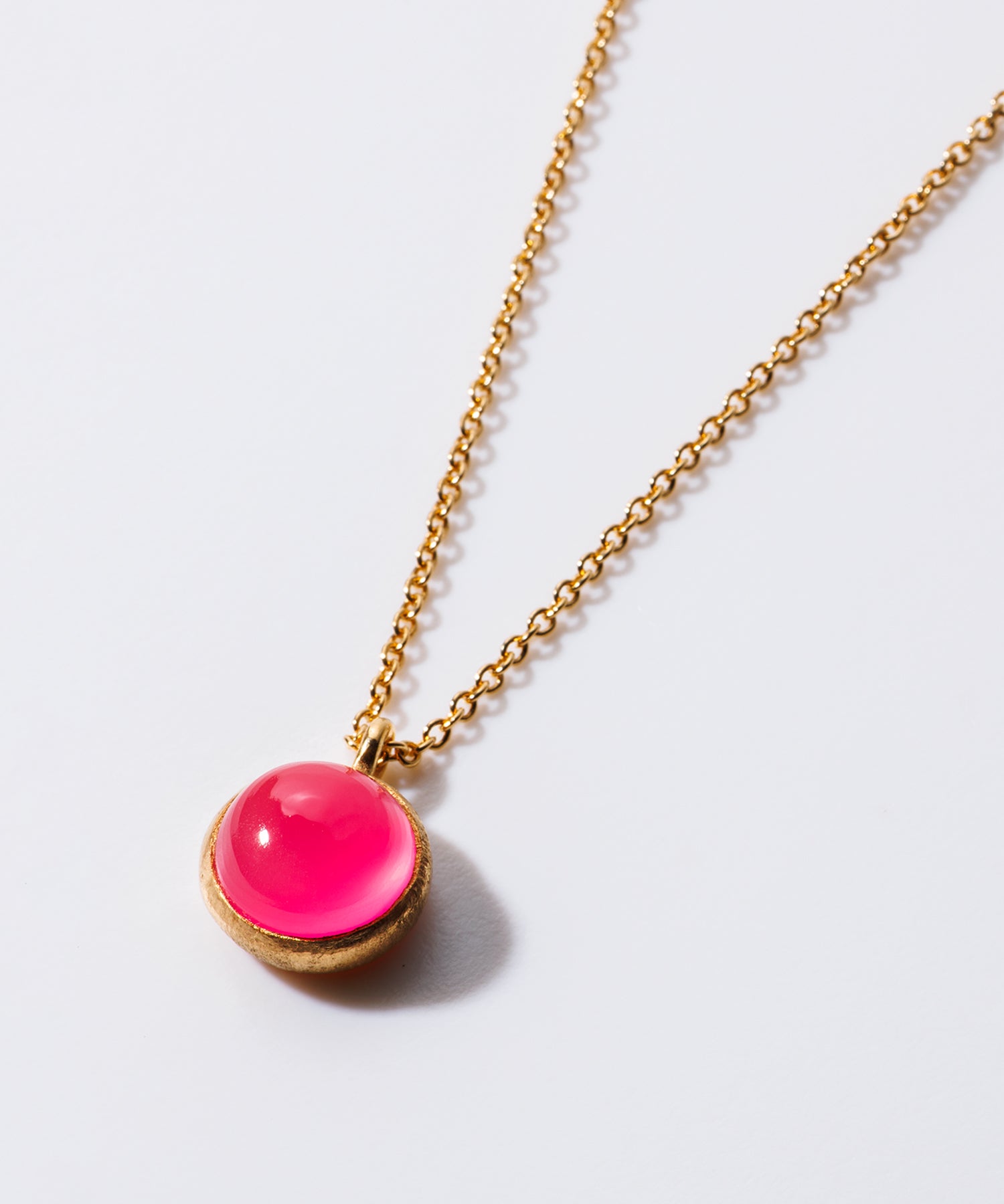 女性らしく存在感のある「パープルピンクカルセドニー」。個性的なショッキングピンクは首元を華やかに彩り、コーディネートのワンポイントにも最適です。