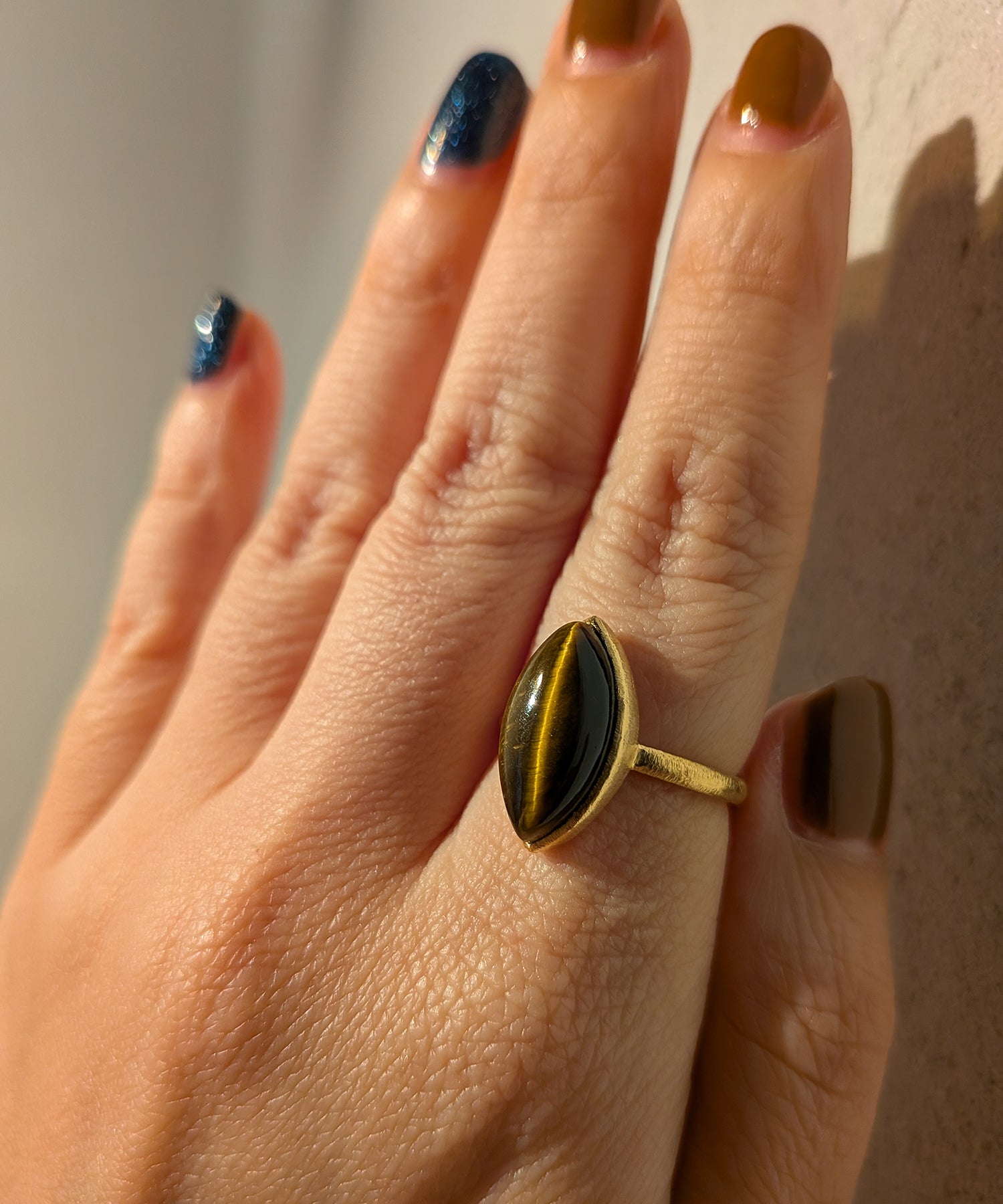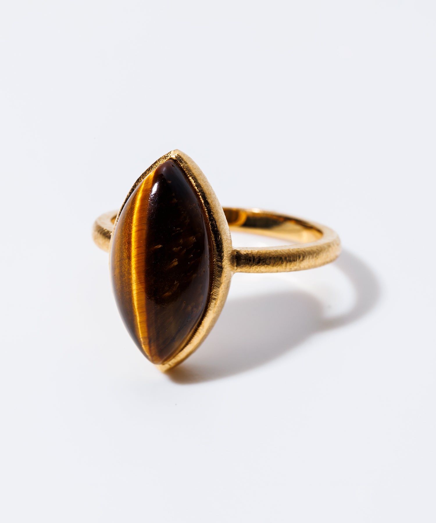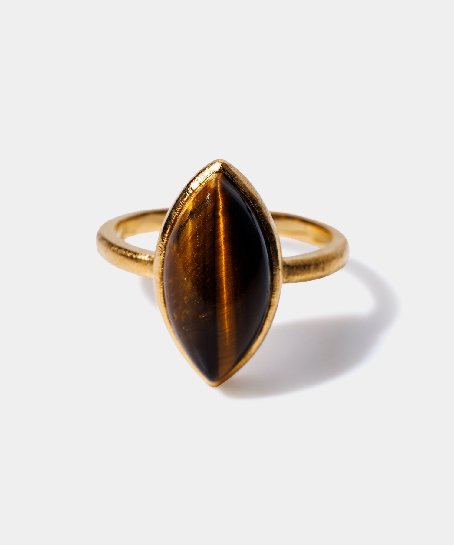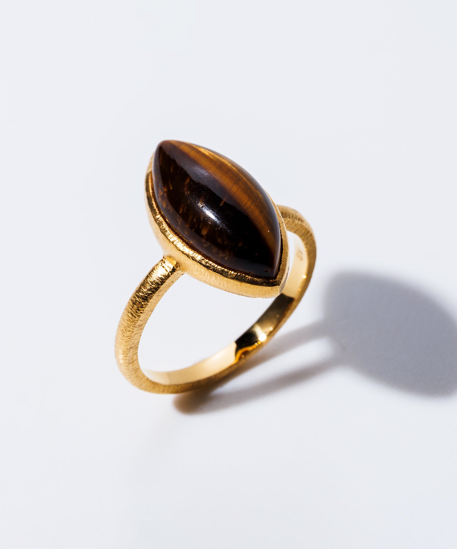 強い光の筋がシャープな印象を与える「タイガーアイ」。その力強いルックスは、ジュエリーにマニッシュでクールなアクセントを求める方にオススメです。カジュアルなデニムからモードなレザーアイテムまで、コーディネートに大胆な華やかさとエッジを加えてくれます。