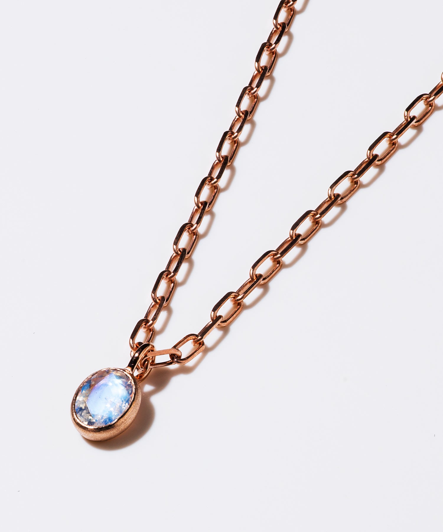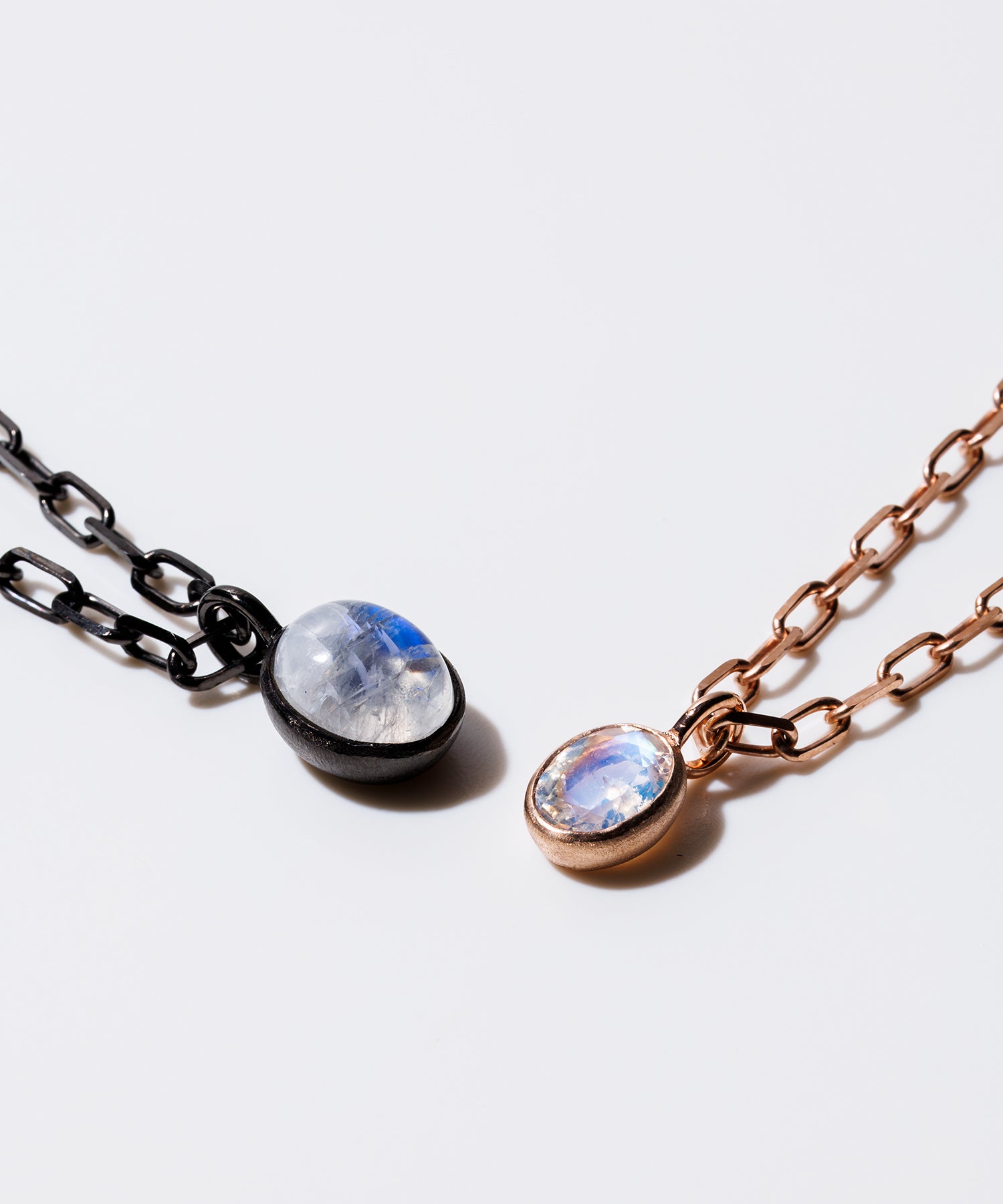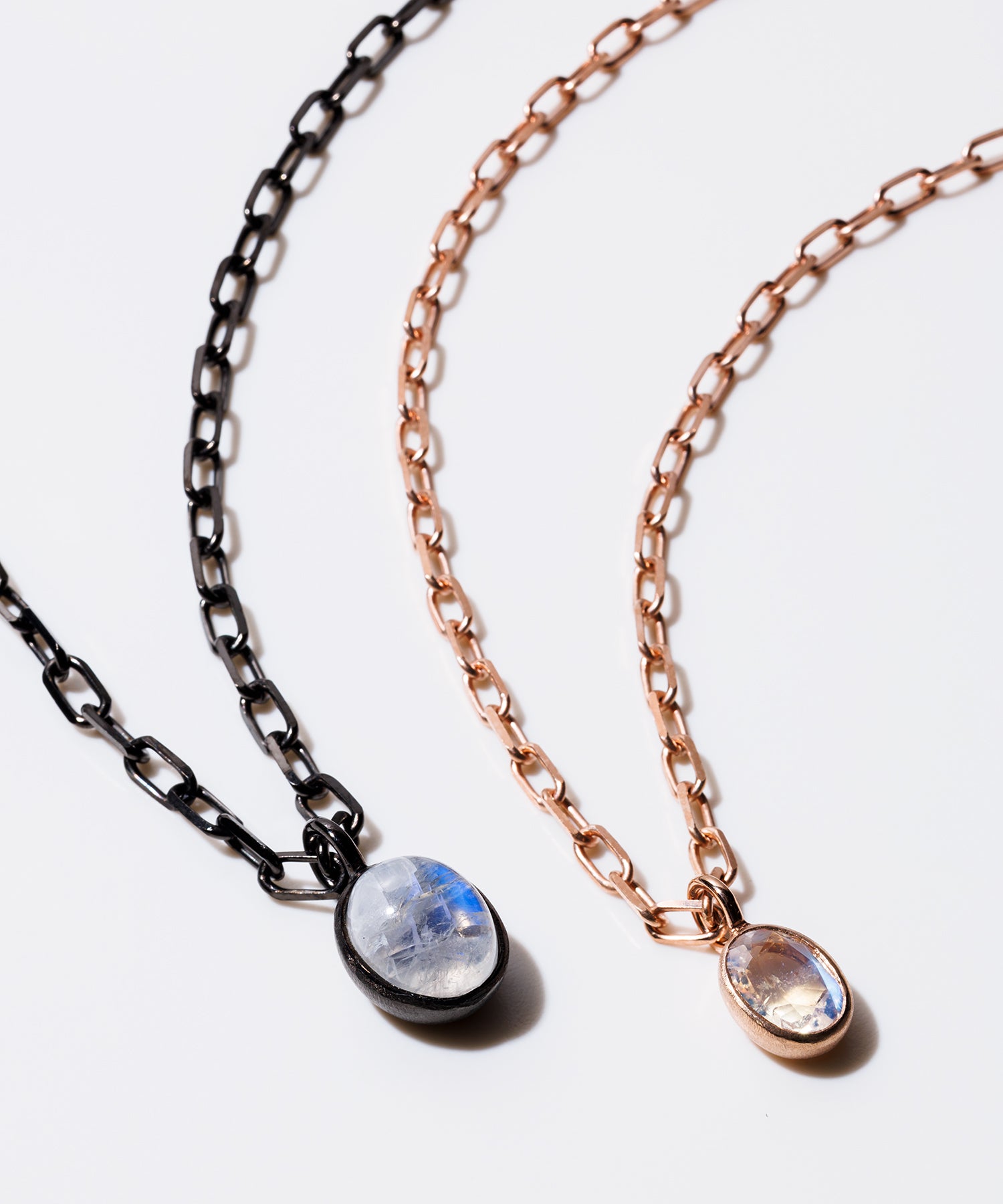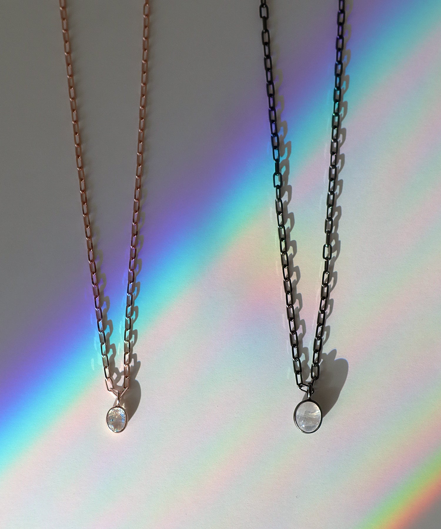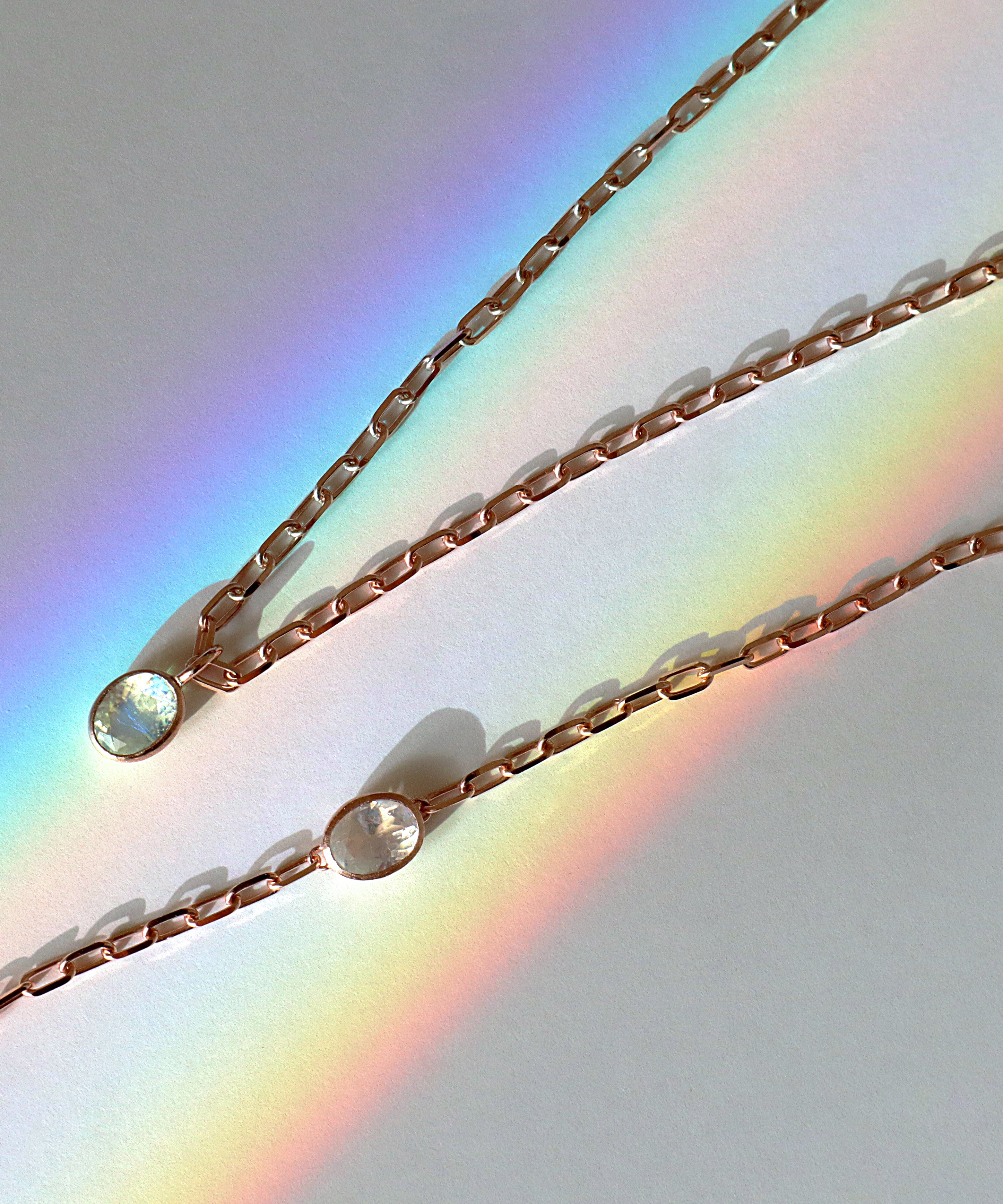 光に当てると様々な表情を見せてくれる「レインボームーンストーン」。自然が織り成すインクルージョンは一つ一つの個性として輝きを放ちます。クリスマススペシャルギフトとして、シラー効果が美しいレインボームーンストーンをセットした、シックでラグジュアリー感あふれるペアネックレスを数量限定で15点ご用意しました。レディースは、甘くやさしいピンクがかった色味が日本人の肌にしっくり馴染むことで人気のピンクゴールドを使用しています。
