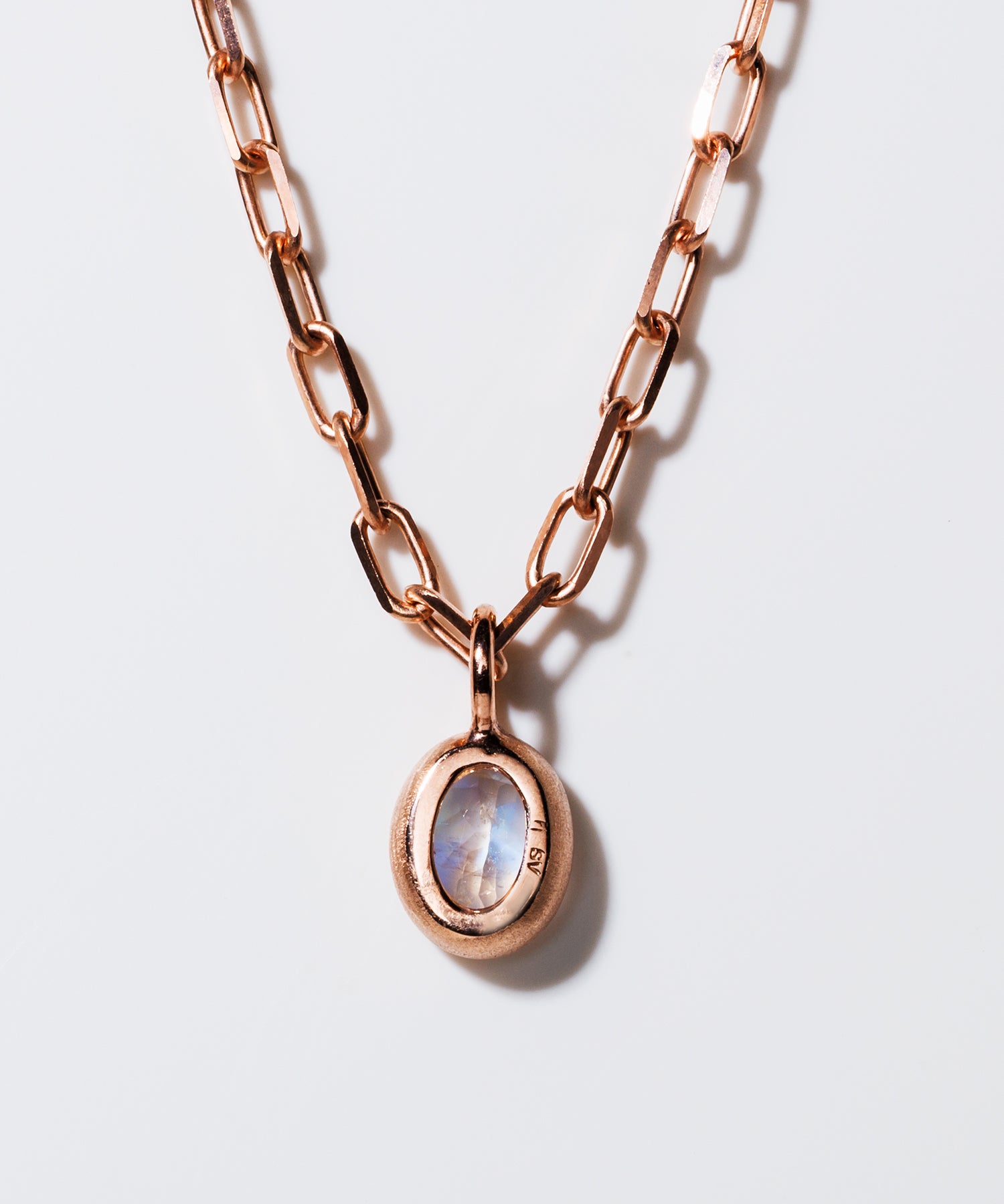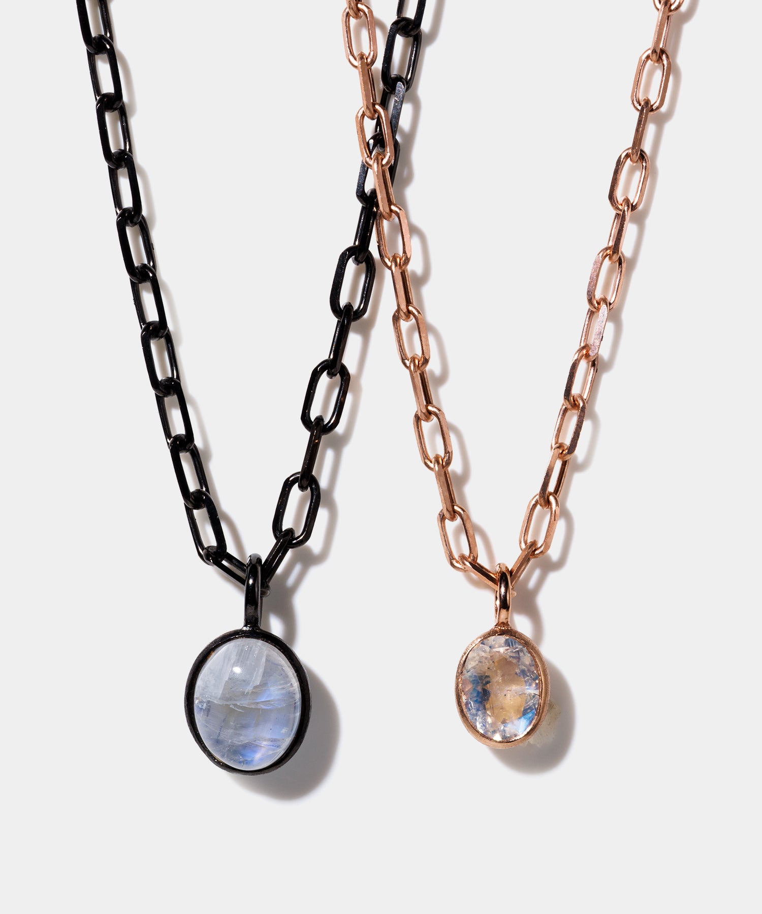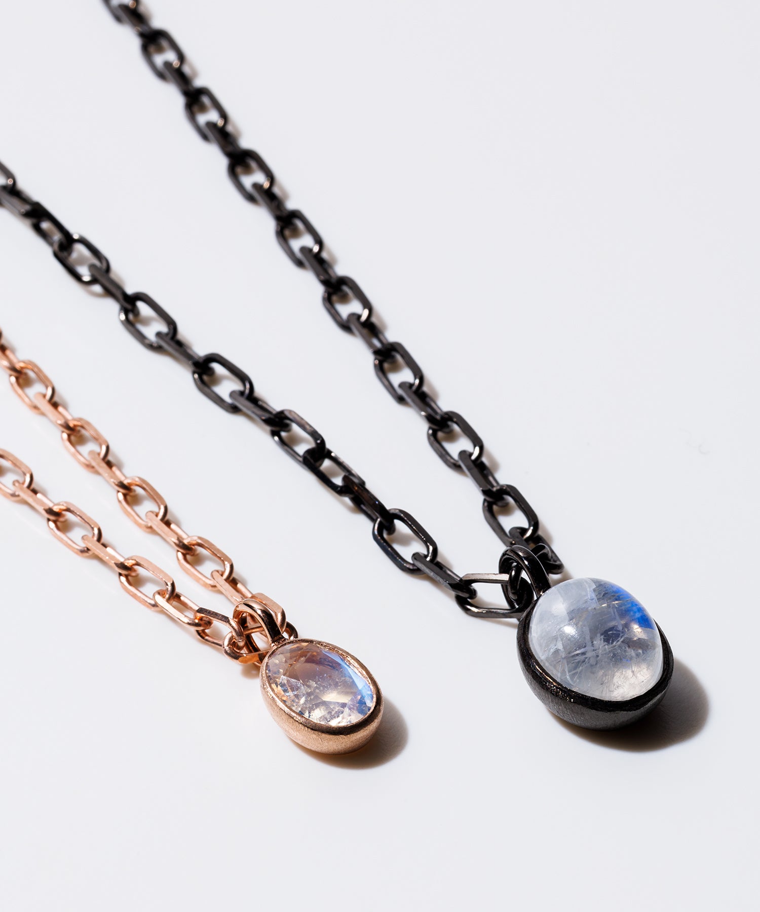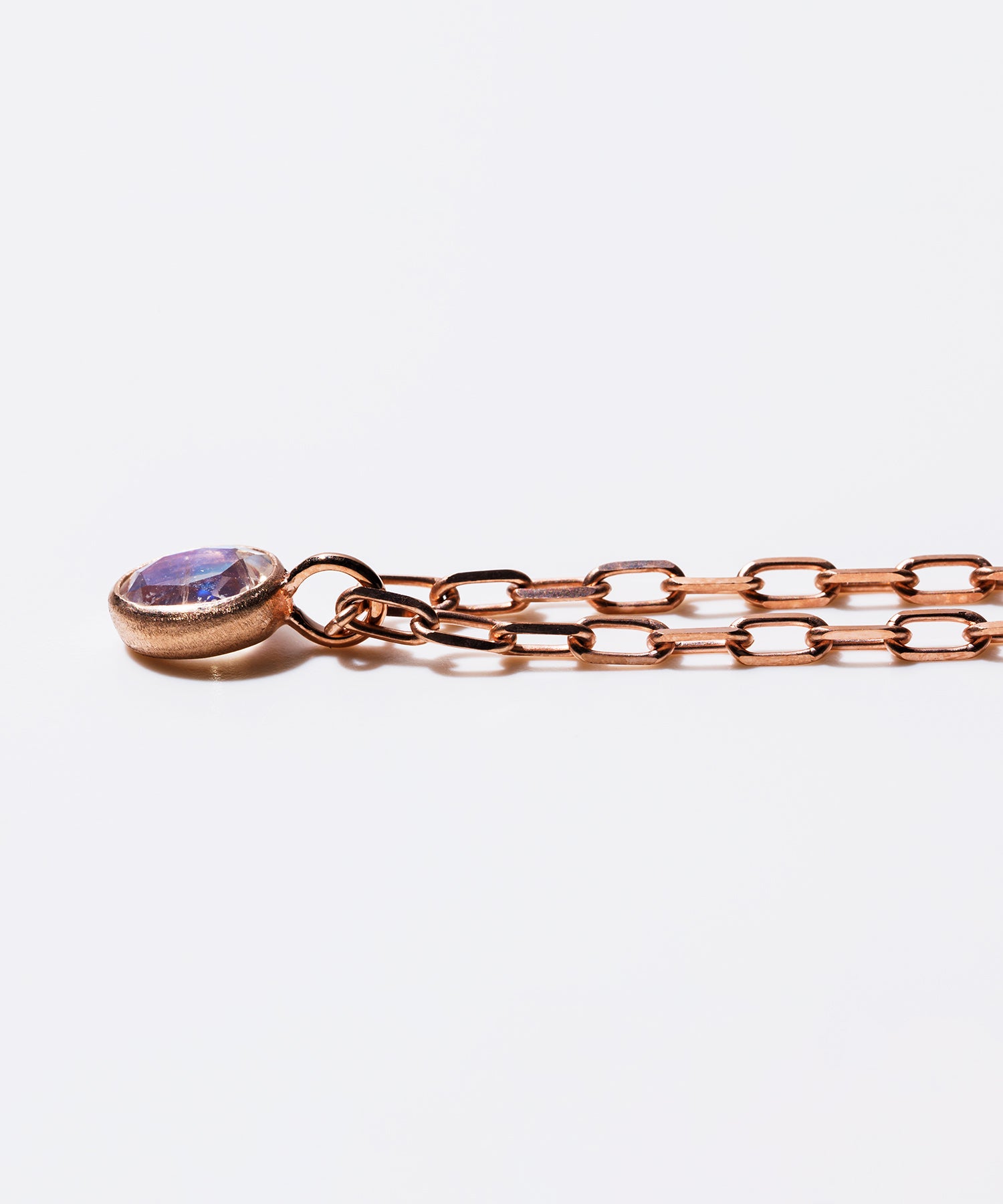 光に当てると様々な表情を見せてくれる「レインボームーンストーン」。自然が織り成すインクルージョンは一つ一つの個性として輝きを放ちます。クリスマススペシャルギフトとして、シラー効果が美しいレインボームーンストーンをセットした、シックでラグジュアリー感あふれるペアネックレスを数量限定で15点ご用意しました。レディースは、甘くやさしいピンクがかった色味が日本人の肌にしっくり馴染むことで人気のピンクゴールドを使用しています。