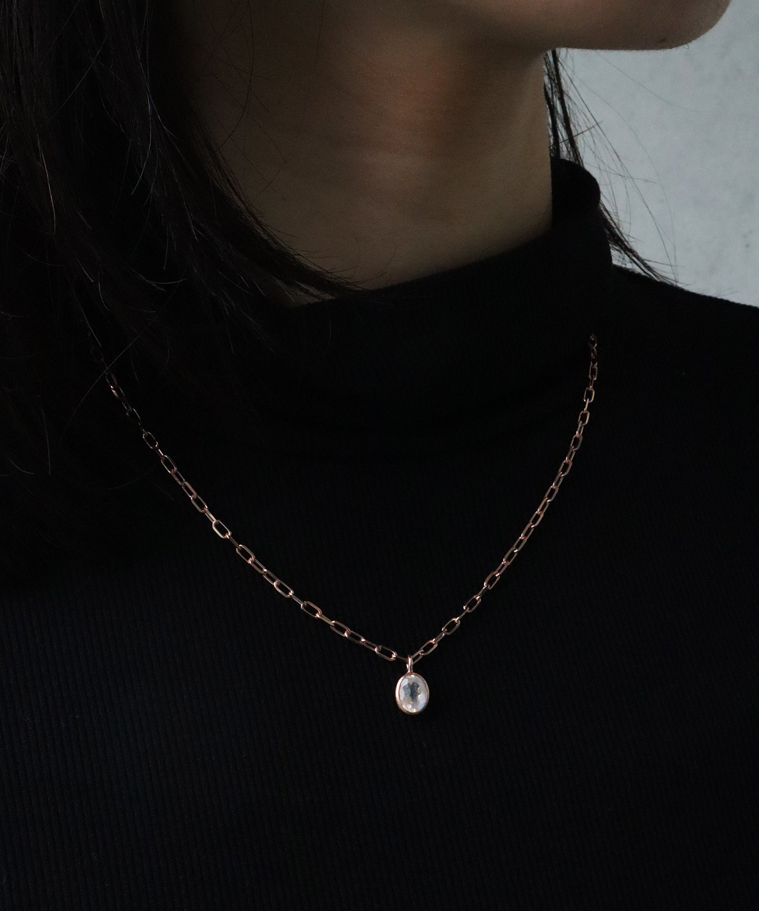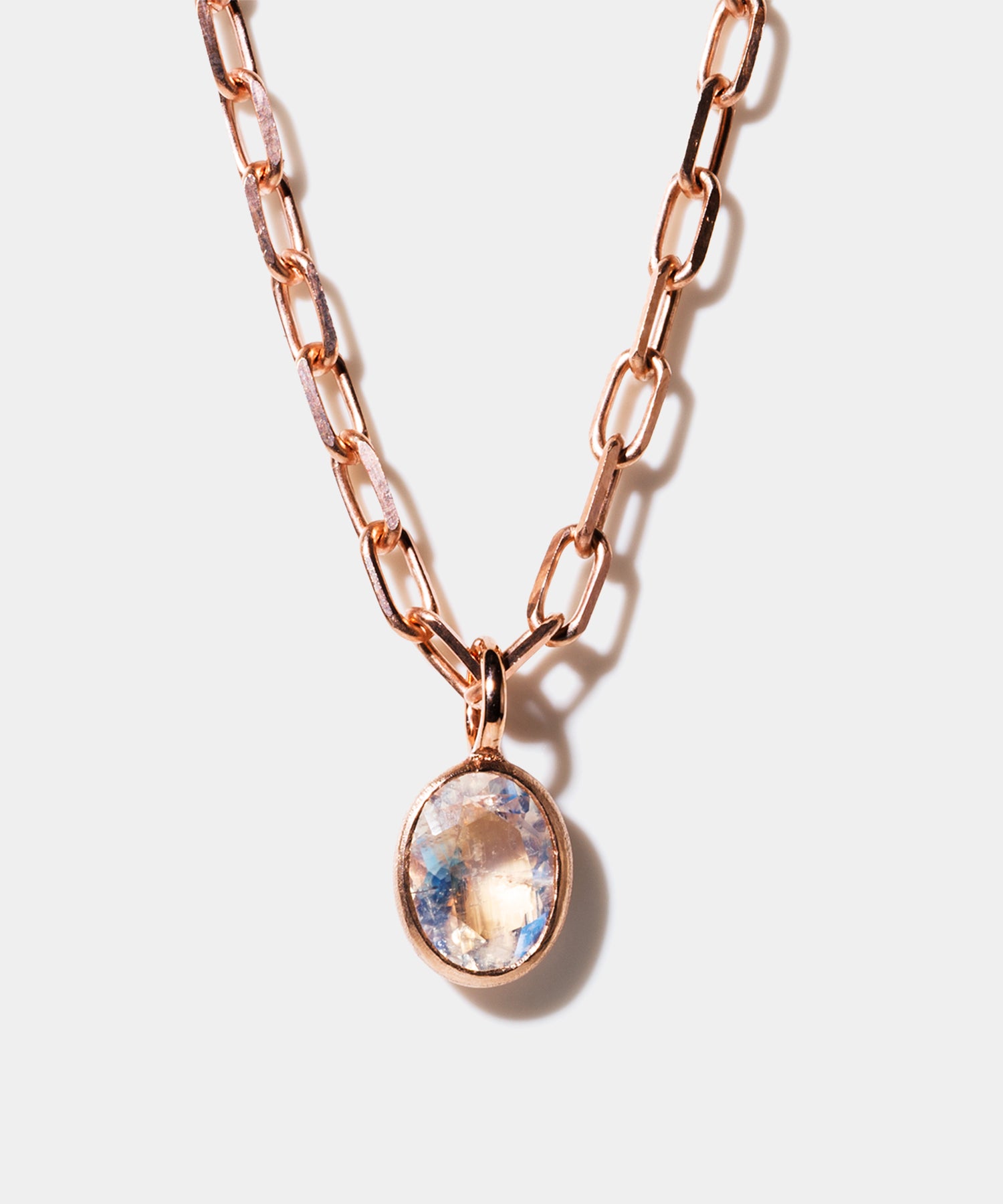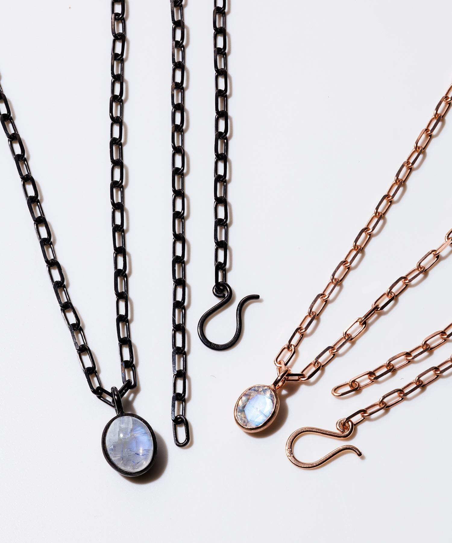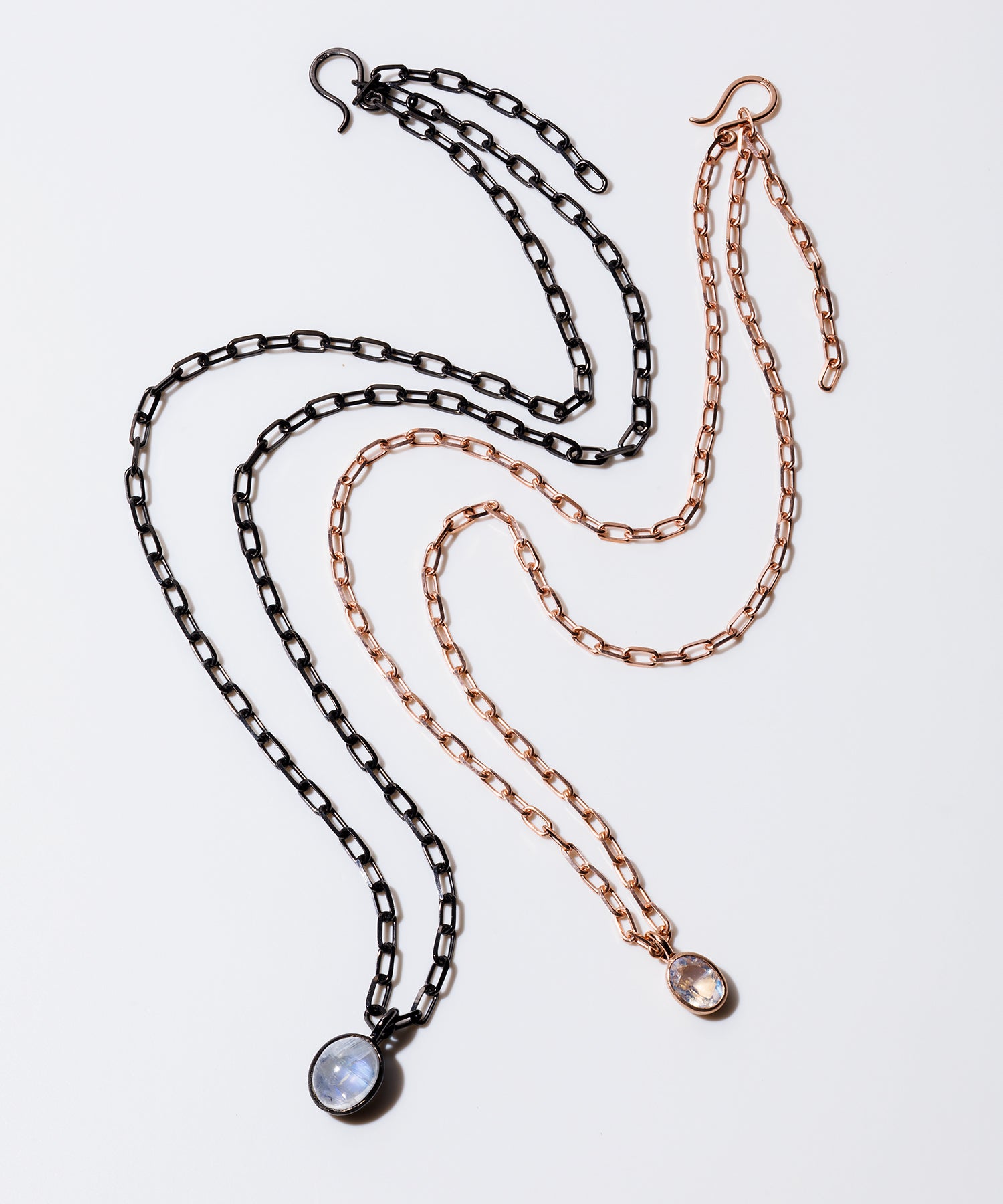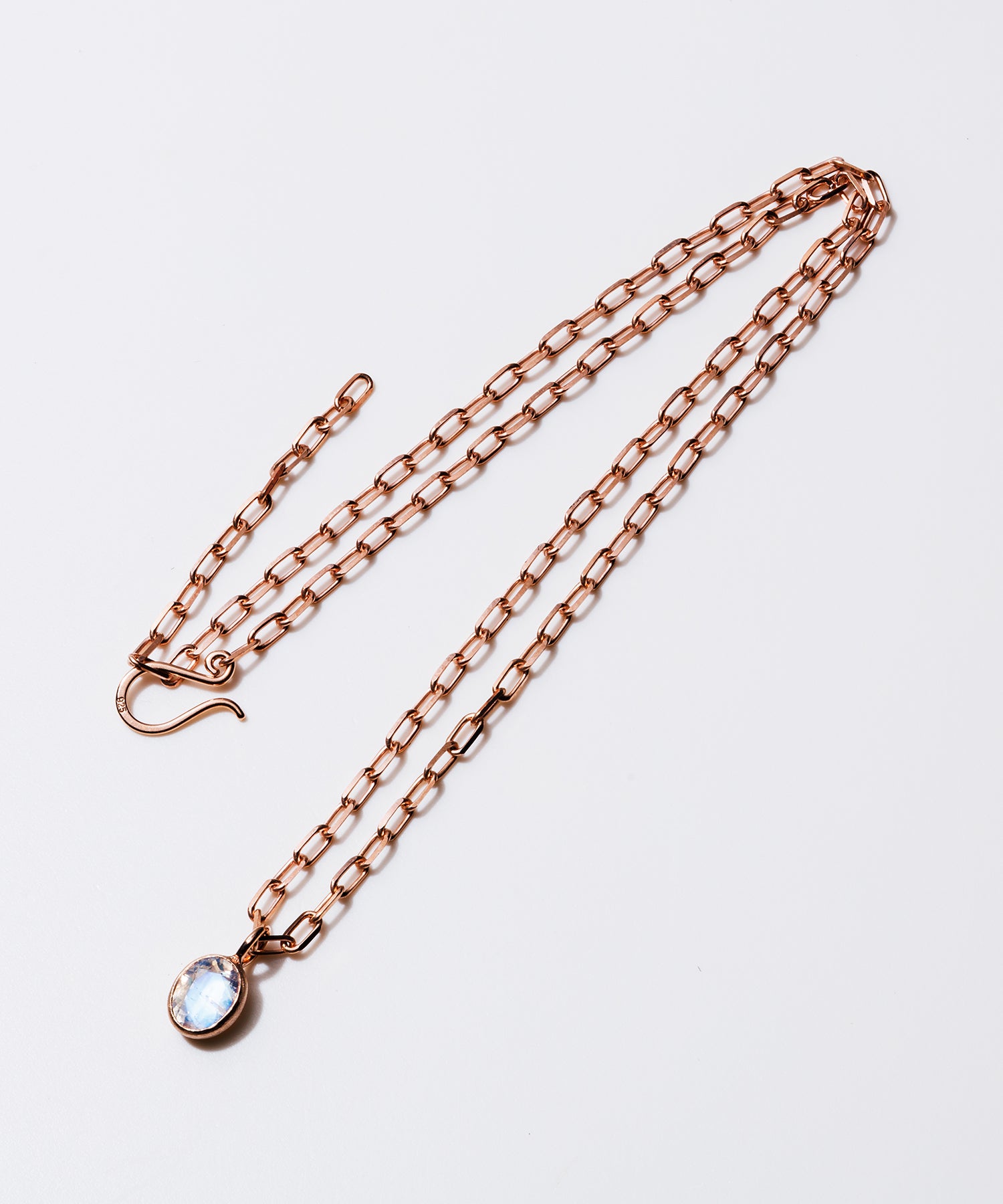 光に当てると様々な表情を見せてくれる「レインボームーンストーン」。自然が織り成すインクルージョンは一つ一つの個性として輝きを放ちます。クリスマススペシャルギフトとして、シラー効果が美しいレインボームーンストーンをセットした、シックでラグジュアリー感あふれるペアネックレスを数量限定で15点ご用意しました。レディースは、甘くやさしいピンクがかった色味が日本人の肌にしっくり馴染むことで人気のピンクゴールドを使用しています。