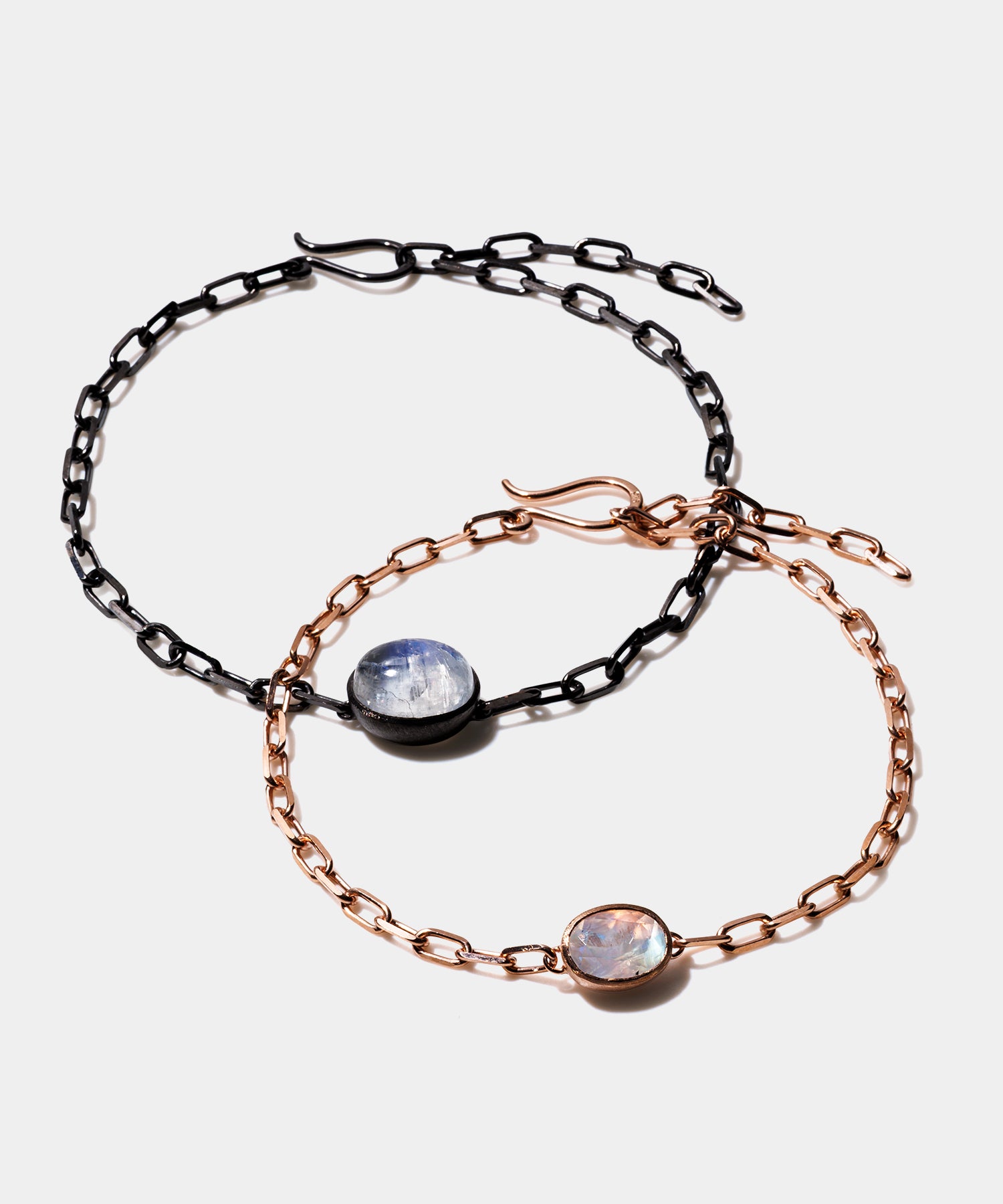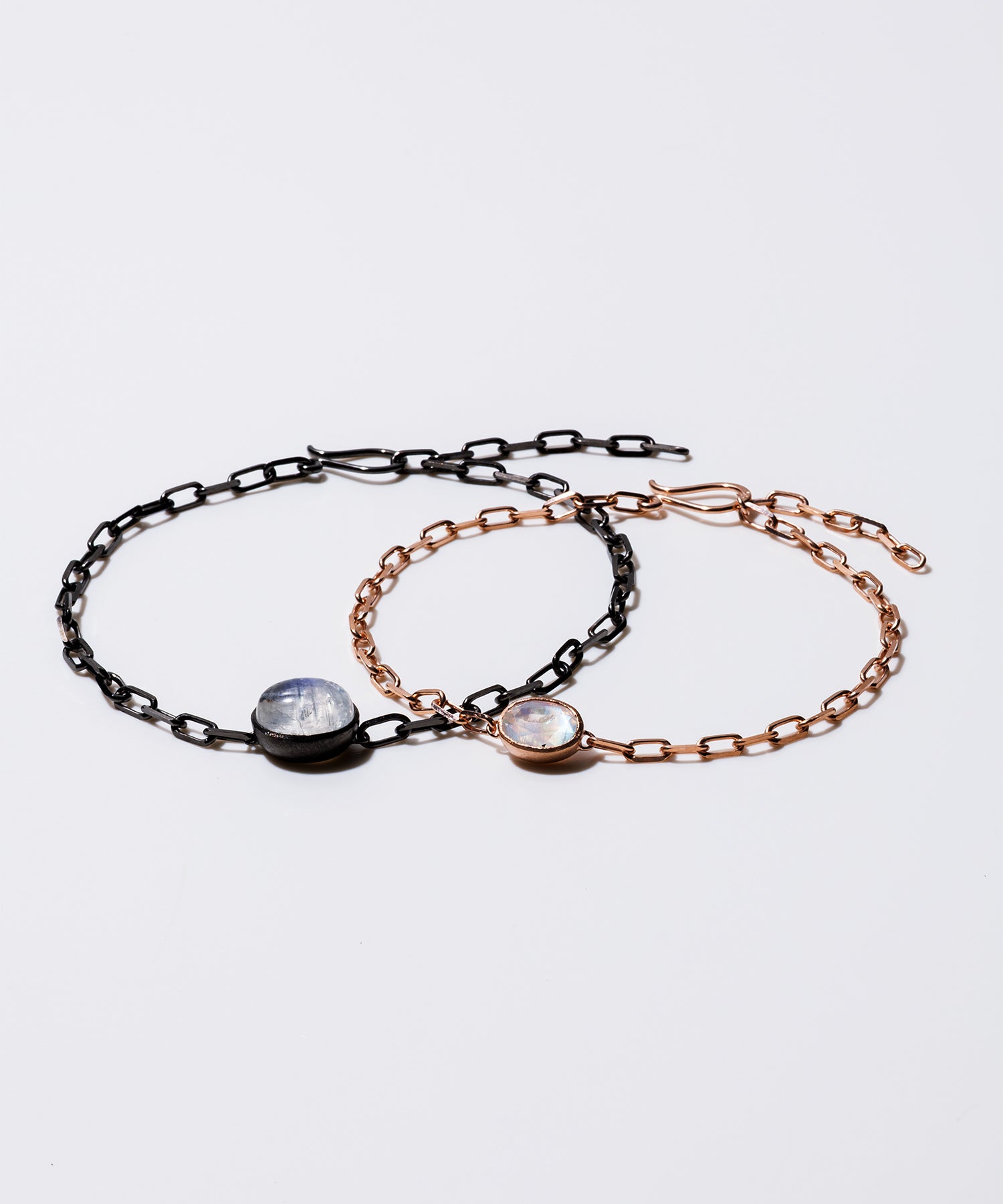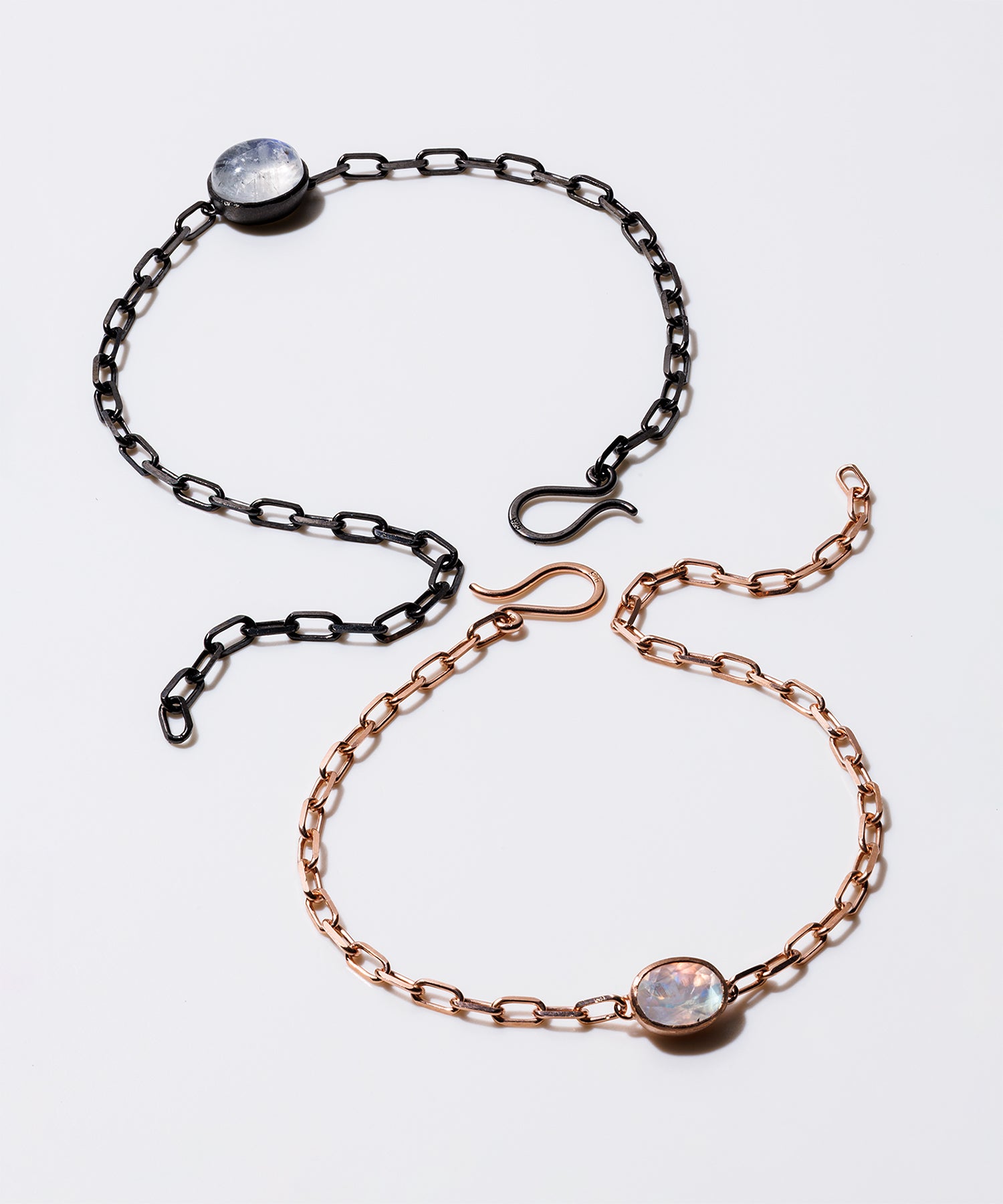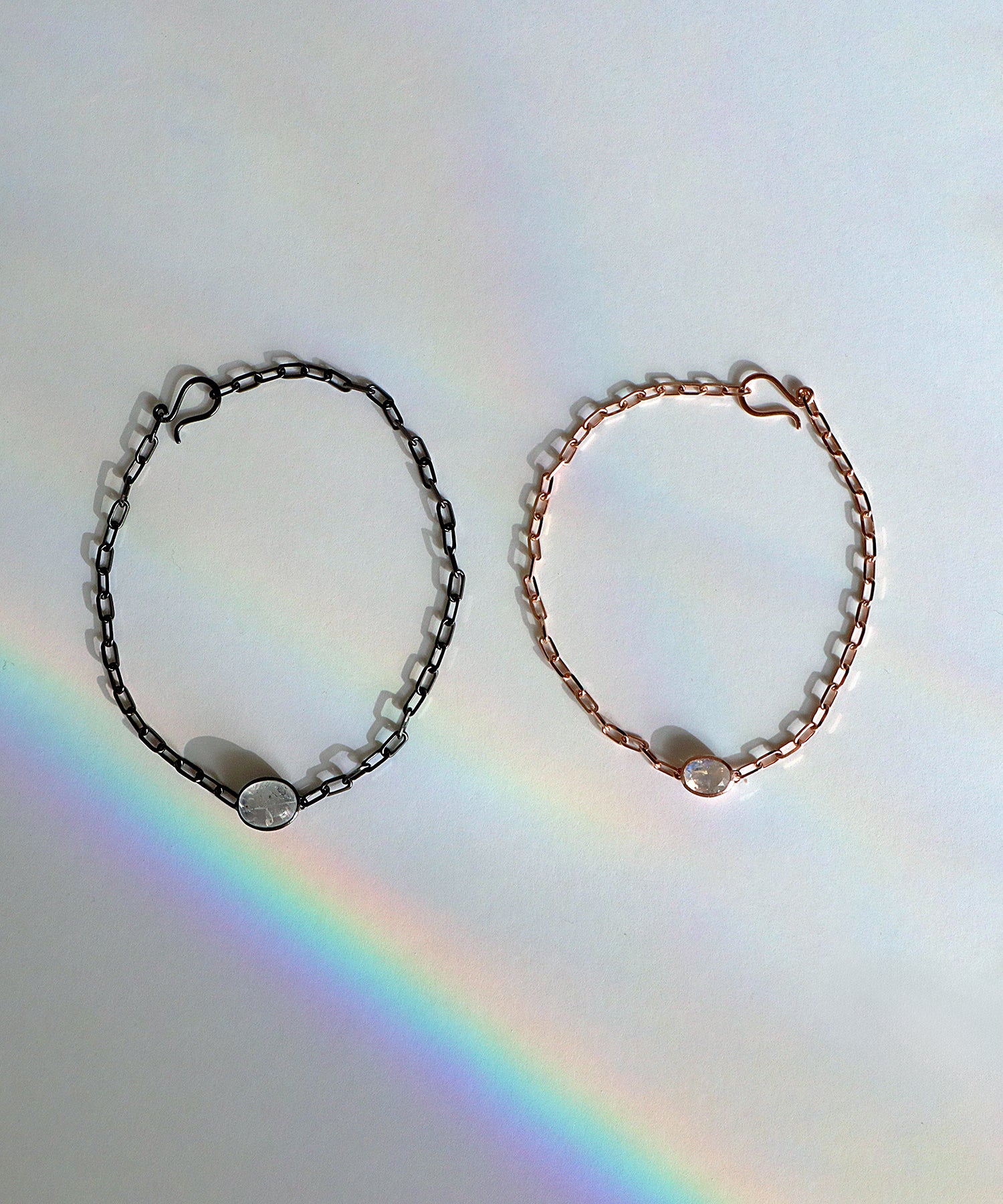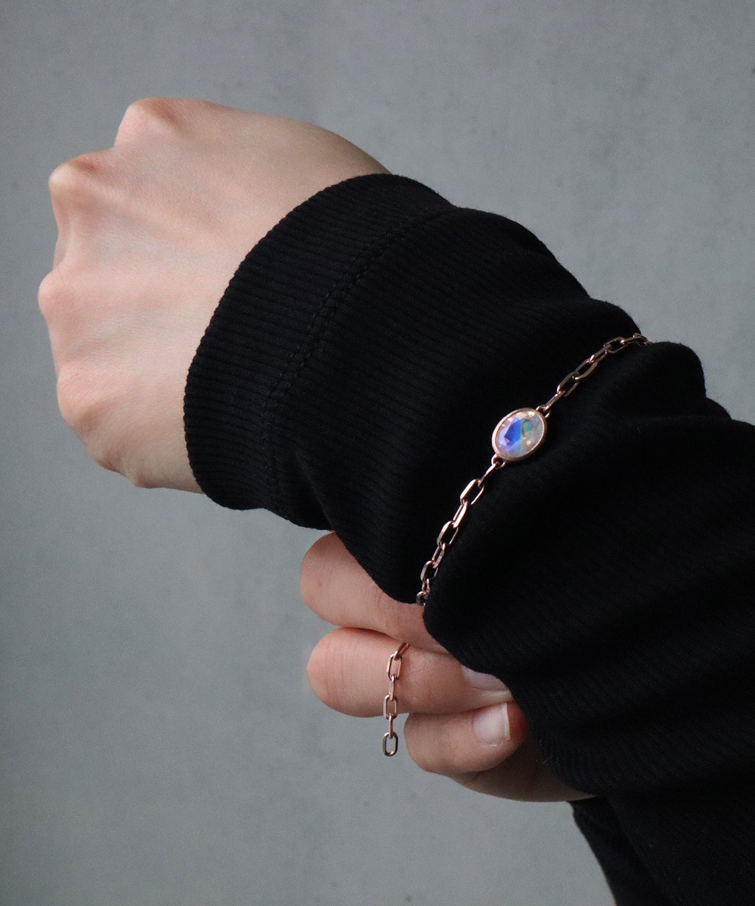 光に当てると様々な表情を見せてくれる「レインボームーンストーン」。自然が織り成すインクルージョンは一つ一つの個性として輝きを放ちます。クリスマススペシャルギフトとして、シラー効果が美しいレインボームーンストーンをセットした、シックでラグジュアリー感あふれるペアブレスレットを数量限定で10点ご用意しました。レディースは、甘くやさしいピンクがかった色味が日本人の肌にしっくり馴染むことで人気のピンクゴールドを使用しています。