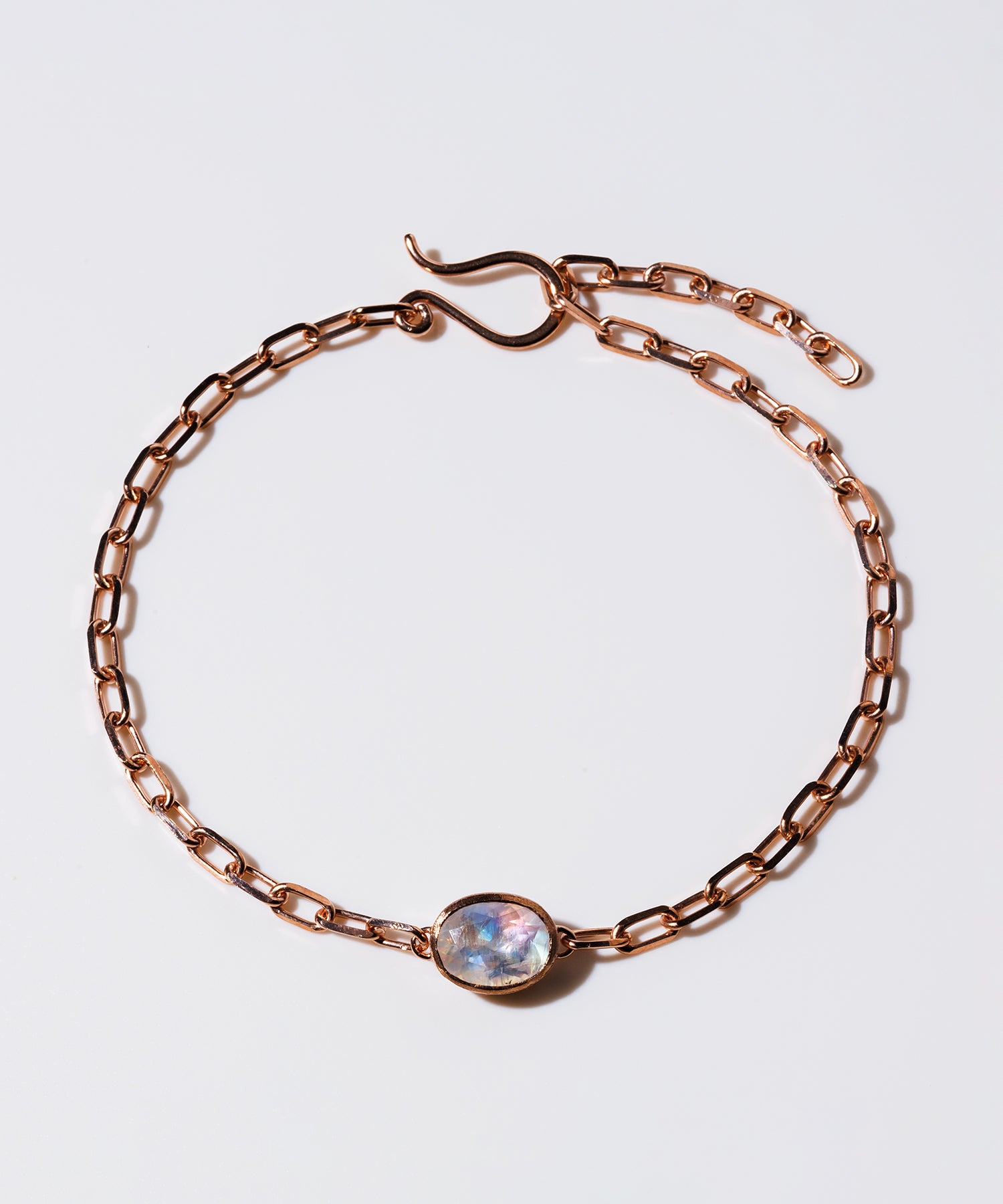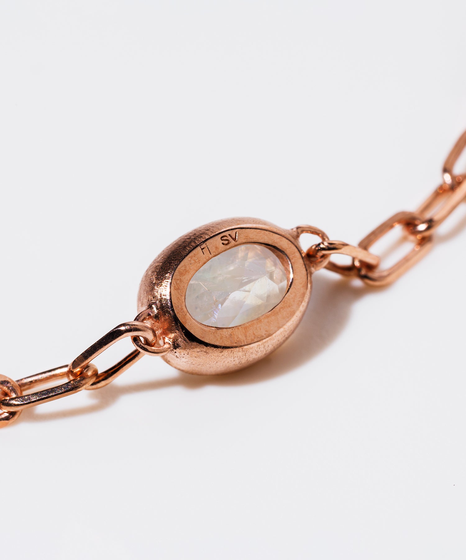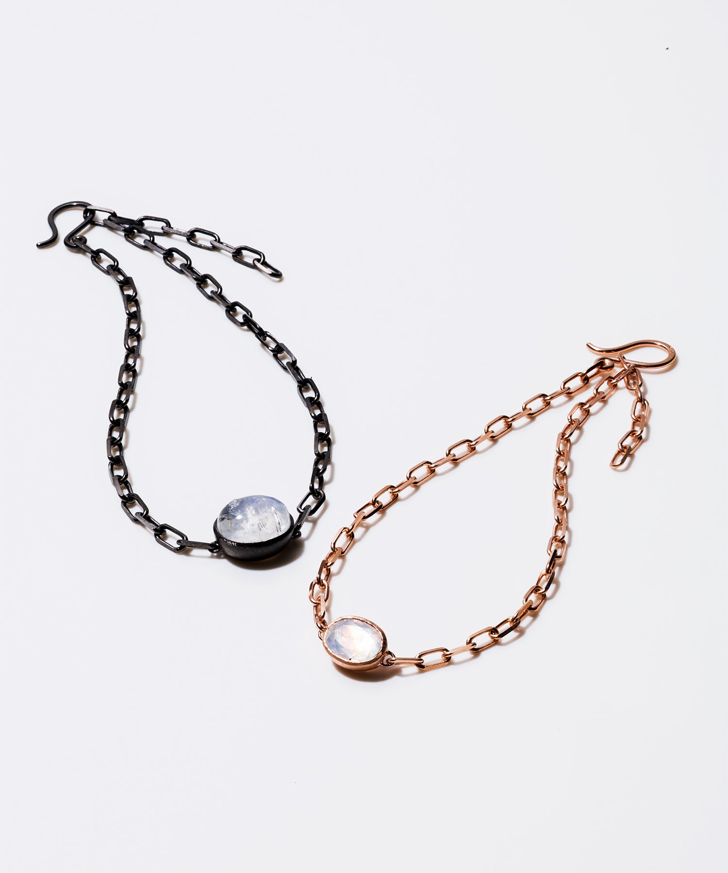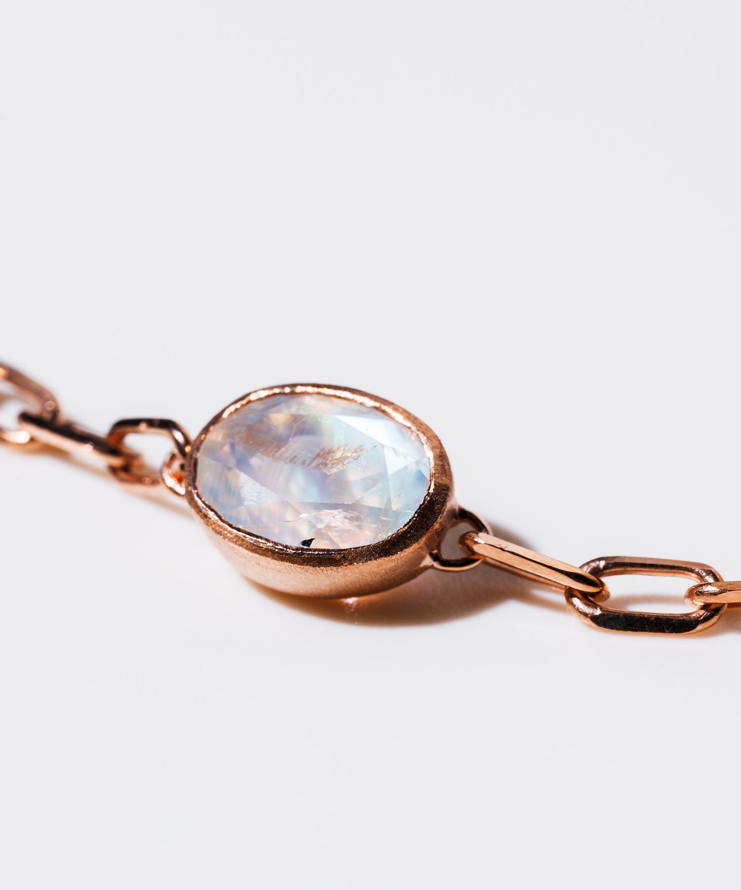 光に当てると様々な表情を見せてくれる「レインボームーンストーン」。自然が織り成すインクルージョンは一つ一つの個性として輝きを放ちます。クリスマススペシャルギフトとして、シラー効果が美しいレインボームーンストーンをセットした、シックでラグジュアリー感あふれるペアブレスレットを数量限定で10点ご用意しました。レディースは、甘くやさしいピンクがかった色味が日本人の肌にしっくり馴染むことで人気のピンクゴールドを使用しています。