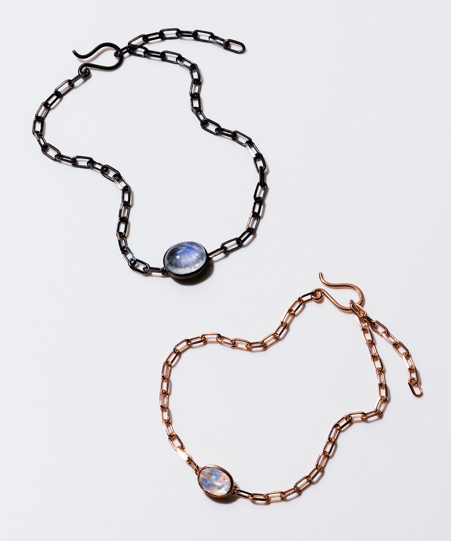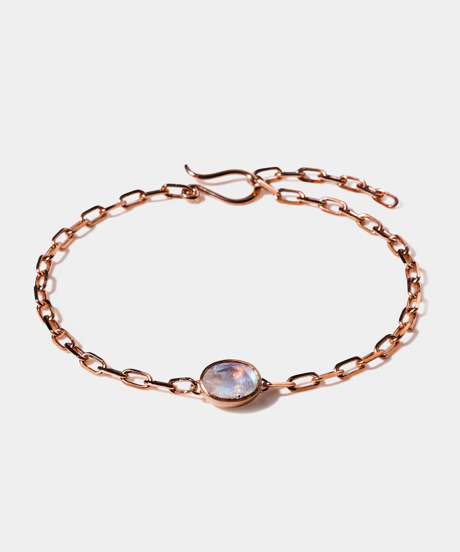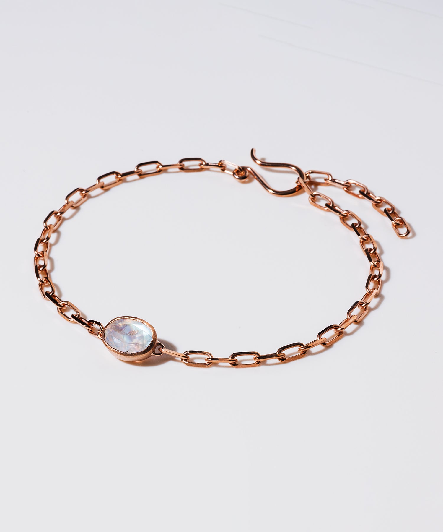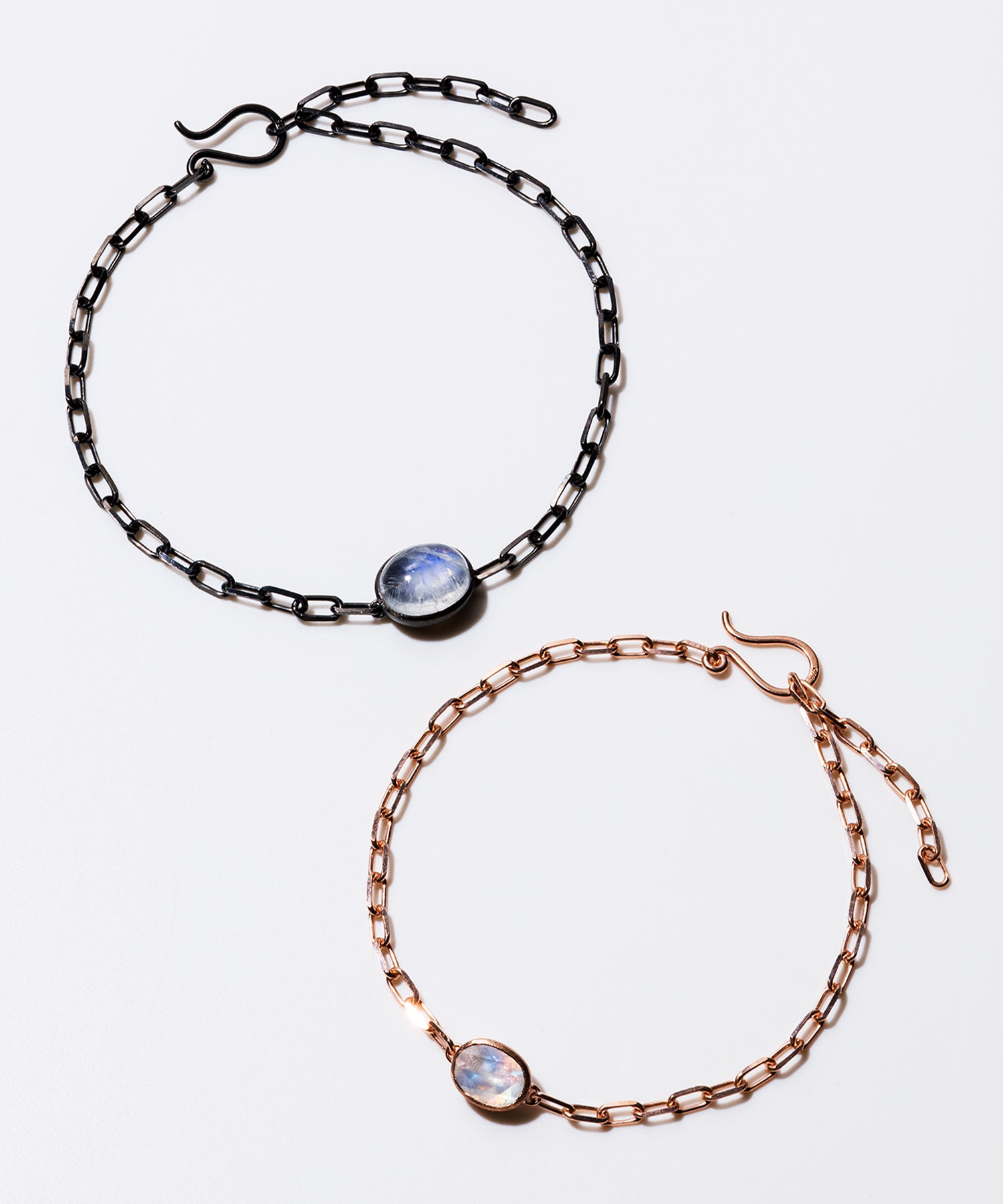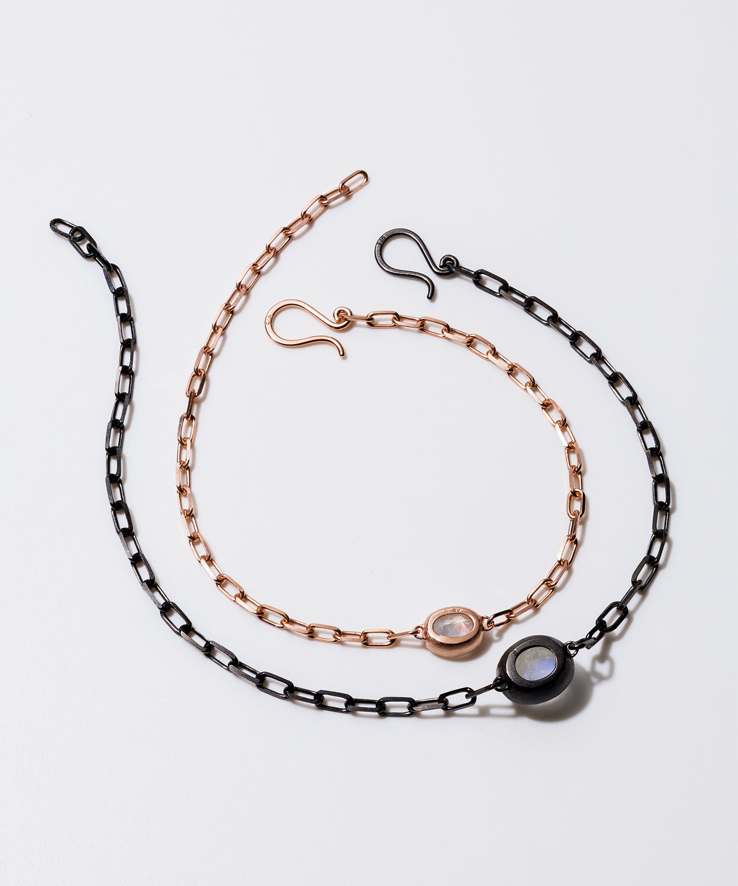 光に当てると様々な表情を見せてくれる「レインボームーンストーン」。自然が織り成すインクルージョンは一つ一つの個性として輝きを放ちます。クリスマススペシャルギフトとして、シラー効果が美しいレインボームーンストーンをセットした、シックでラグジュアリー感あふれるペアブレスレットを数量限定で10点ご用意しました。レディースは、甘くやさしいピンクがかった色味が日本人の肌にしっくり馴染むことで人気のピンクゴールドを使用しています。